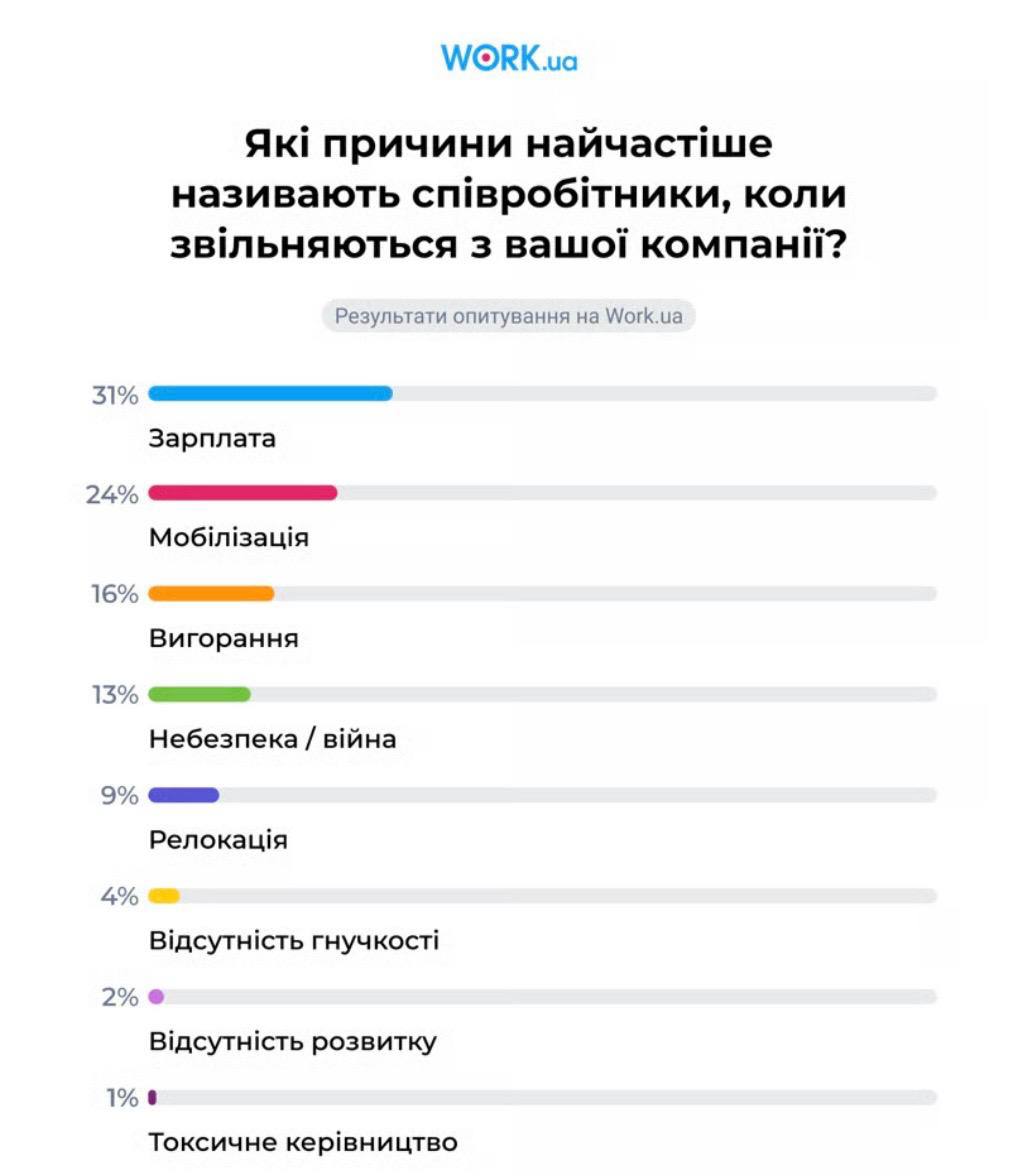 «Основными драйверами кадровых потерь остаются финансовые и факторы безопасности. Чаще всего работники покидают компании из-за уровня оплаты труда (31%). В то же время, значительное влияние имеют и последствия войны: мобилизация (24%), опасность и общая нестабильность (13%), а также вынужденная релокация (9%)», — пишет Южанина.