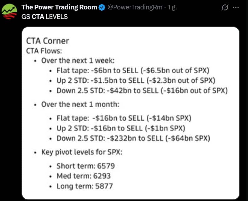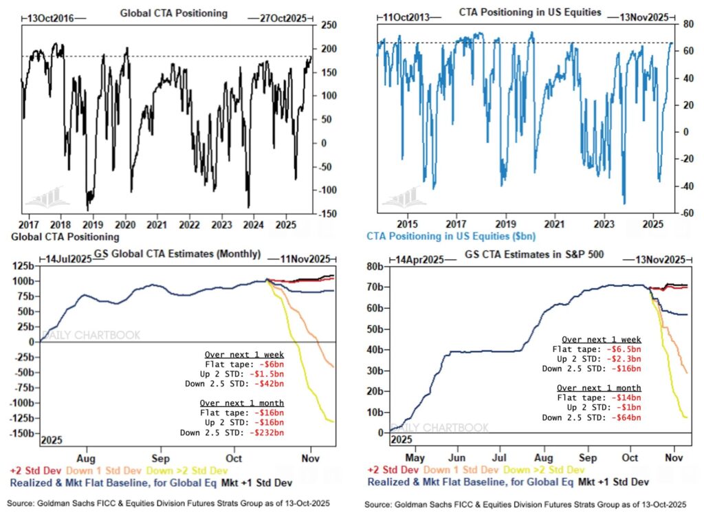 В понедельник рынок попытался восстановиться, чему способствовали сильные результаты Джей Пи Морган Чейзкоторый показал солидную доходность инвестиционно-банковской деятельности. Но энтузиазм быстро остыл. Макроэкономических данных нет. – приостановлено из-за продолжающегося закрытия правительства США – только усугубляет путаницу. Без точных данных по инфляции, розничным продажам и производству инвесторы действуют в сумерках. В таких условиях это количественные моделикак и CTA, де-факто стал компасом рынка.