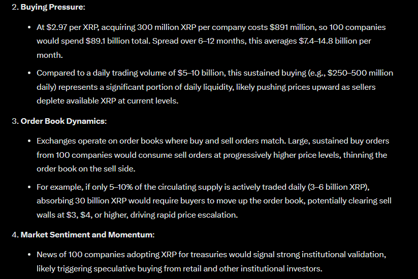 Грок отметил, что общая сумма покупки составит 30 миллиардов XRP. Это составляет половину общего количества XRP в обращении. Чат-бот предположил, что эти компании, скорее всего, будут приобретать XRP постепенно в течение шести-двенадцати месяцев, а не совершать покупку сразу. Главным образом, чтобы предотвратить дестабилизацию рынка.
