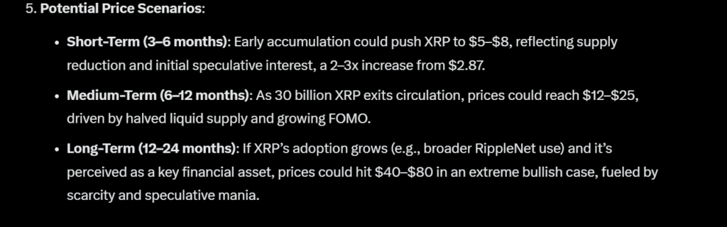 Основываясь на этой модели, Грок предсказал, что XRP вырастет до $5–8 в течение следующих шести месяцев. Это представляет собой увеличение в 2 или даже в 3 раза с 2,87 доллара.