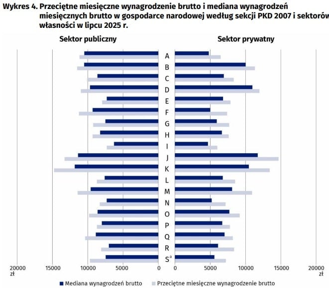 Средняя зарплата в народном хозяйстве в июле 2025 года составила 8 866,43 злотых. При этом доходы в государственном секторе также оказались выше, чем в частном. В государственном секторе она составила 9 605,19 злотых, что составило 108,3% от общей стоимости. В частном секторе средняя зарплата составила 8 530,80 злотых (96,2% от общей стоимости).