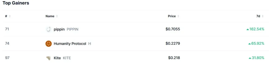 Явным лидером прошлой недели является пиппин (PIPPIN), который прибавил целых 162,54%.. Поворотным моментом для проекта стал листинг на бирже WEEX 17 декабря 2025 года. Затем Memecoin появился на KuCoin в начале января 2026 года. После повышения цен в этом случае также произошла массовая ликвидация коротких позиций, что еще больше подогрело рост цен.