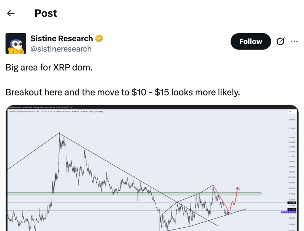 Основываясь на этом историческом конкурентном преимуществе, аналитики говорят, что XRP может превысить 121%. Это ставит цель в 4,50 доллара. Недавно компания Sistine Research предположила, что XRP также может «легко» достичь диапазона 10–15 долларов. Только если его доминирующее положение на рынке пробьет ключевой уровень сопротивления и увеличится с 4% до 4,5%.
