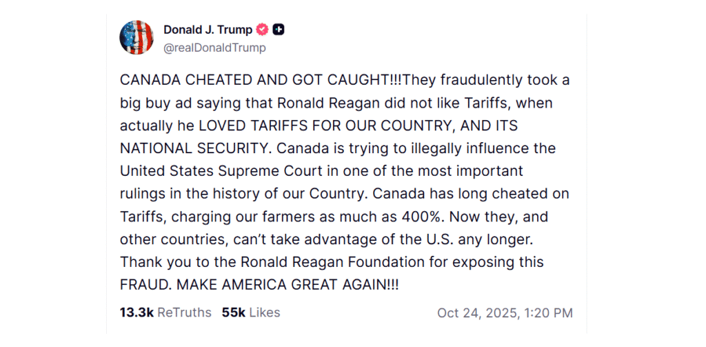 Дональд Трамп объявил, что долгие и болезненные торговые переговоры, которые США ведут с Канадой, прерываются без соглашения. Это реакция на медийную и пиар-деятельность, направленную на американскую общественность, которую якобы предприняли канадцы – и которую Белый дом посчитал попыткой манипулирования политикой, правовой ситуацией и внутренними настроениями в США.