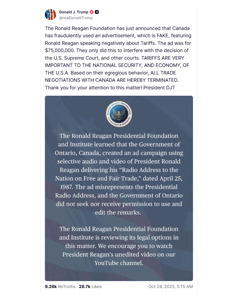 Рекламные объявления, которые канадцы начали распространять в США — их транслировали на Bloomberg и Newsmax, а также планировалось транслировать на Fox News, Fox Sports, NBC, CBS, CNBC, ESPN и ABC — должны были содержать речь Рональда Рейгана, в которой он высказывался против тарифов и таможенных барьеров. Эта речь должна была быть «раскрашенной» и содержать элементы, которых на самом деле не было.