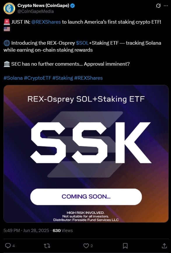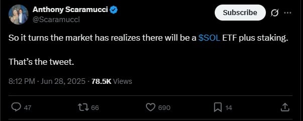 Энтони Скарамуччи также присоединился к этой группе. Основатель Skybridge Capital недавно написал на X, что Sol ETF, вероятно, скоро увидит свет.