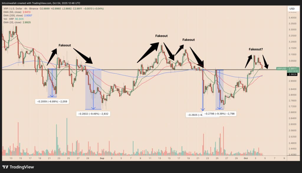 С ноября прошлого года XRP колебался примерно в 3 доллара несколько раз. Каждая пункция выглядела многообещающе, но она закончилась тем же: короткий энтузиазм, за которым последовало исправление и возвращение к отправной точке. На этот раз ситуация выглядит более серьезно, потому что потеря поддержки совпадает с ключевым уровнем 200-ступенчатой EMA в четырехчасовом интервале. И это сигнал, который опытный аналитик не игнорирует.