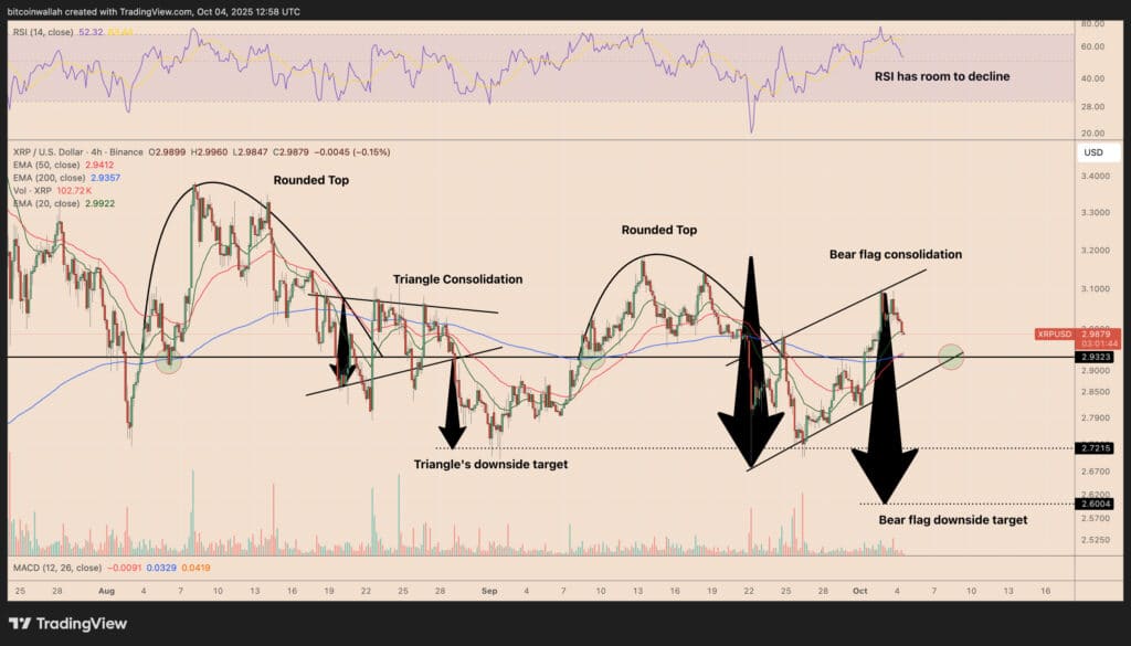 Сегодня график выглядит тревожным. Еще один округлый пик и что -то, что напоминает четырехчунный интервал Медвежий флагто есть классическое формирование продолжения снижения. Если эта структура подтверждена, диапазон движения может достигать 15%. Это принесет XRP около 2,60 доллара.