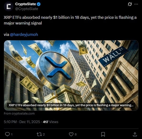 С другой стороны, CryptoSlate указывает, что ETF в настоящее время действуют скорее как буфер, защищающий от более глубокого падения, чем как катализатор. Портал цитирует, среди прочего: данные Glassnode показали, что открытый интерес к фьючерсам XRP упал с 1,7 миллиарда в начале октября примерно до 0,7 миллиарда, то есть на 59%.