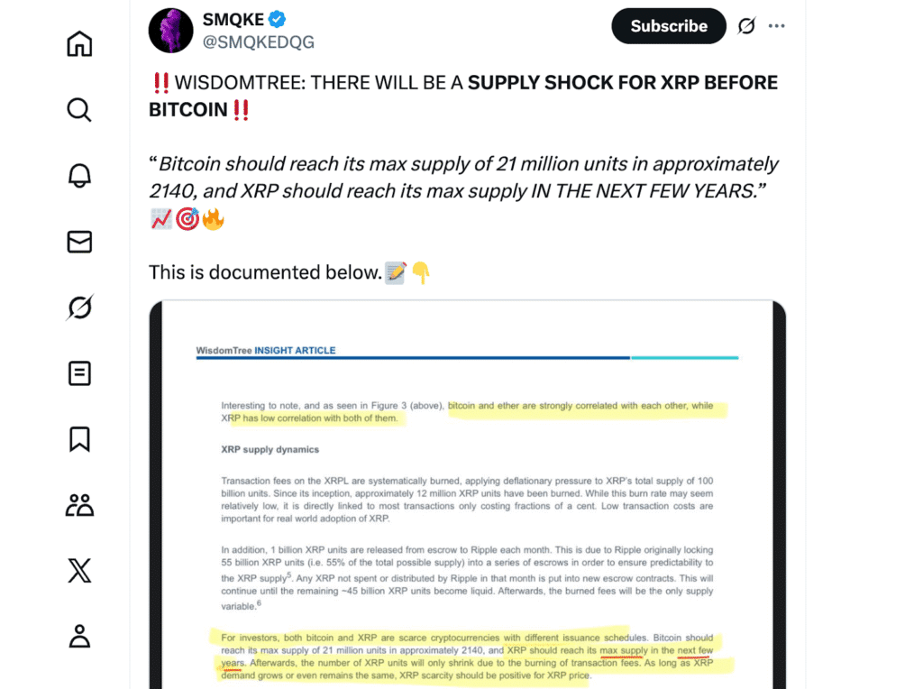 Это наблюдение, снова обнаруженное исследователем сообщества SMQKE, указывает на подробную информацию WisdomTree. На это указывает анализ, проведенный в ноябре прошлого года, в котором динамика предложения XRP сравнивалась с долгосрочной моделью дефицита биткойнов.