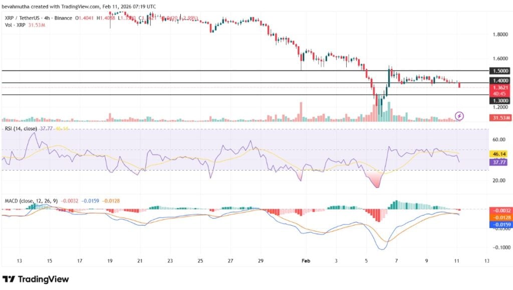 Данные о сети Ripple и спросе на ETF указывают на осторожность. А как ситуация с XRP выглядит на графиках? На данный момент токен близок к уровню поддержки ($1,35). Индекс относительной силы (RSI) равен 37. Это говорит о том, что рынок приближается к состоянию перепроданности. Индикатор Moving Average Convergence and Divergence (MACD) также демонстрирует отрицательную динамику. В таком случае у Ripple есть шанс восстановиться в цене. В этом сценарии возможное направление – $1,45-1,50.
