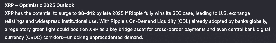 Qwen3-Max отмечает, что дополнительные катализаторы, такие как одобрение ETF или интеграция с крупными банками, могут поднять цену XRP выше 8 долларов. Это, при благоприятных условиях, вероятно, позволит достичь целевого показателя в 12 долларов.