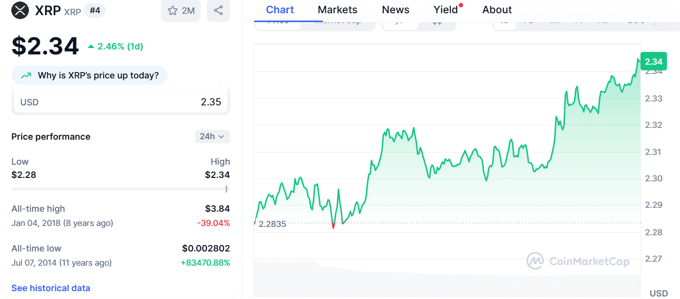 XRP прошел долгий путь от самого низкого уровня примерно с 11 лет назад. Данные из CoinmarketCap показывают, что обменный курс увеличился более чем на 83 000% от самого низкого уровня в истории. Он получил этот уровень токена в июле 2014 года и составил 0,0028 доллара США.