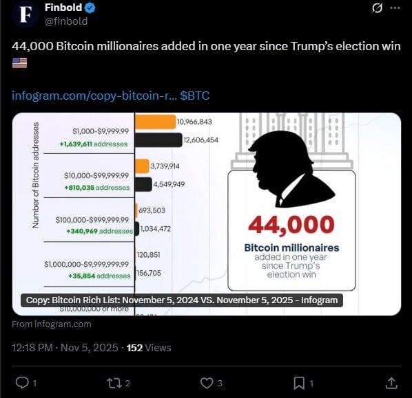 Аналитики Finbold связали столь резкое увеличение числа миллионеров BTC с президентством Дональда Трампа. В ходе предвыборной кампании политик дал отрасли немало обещаний. Поэтому в тот момент, когда стало ясно, что он снова сядет в Белый дом, на рынке криптовалют начался бычий рынок.