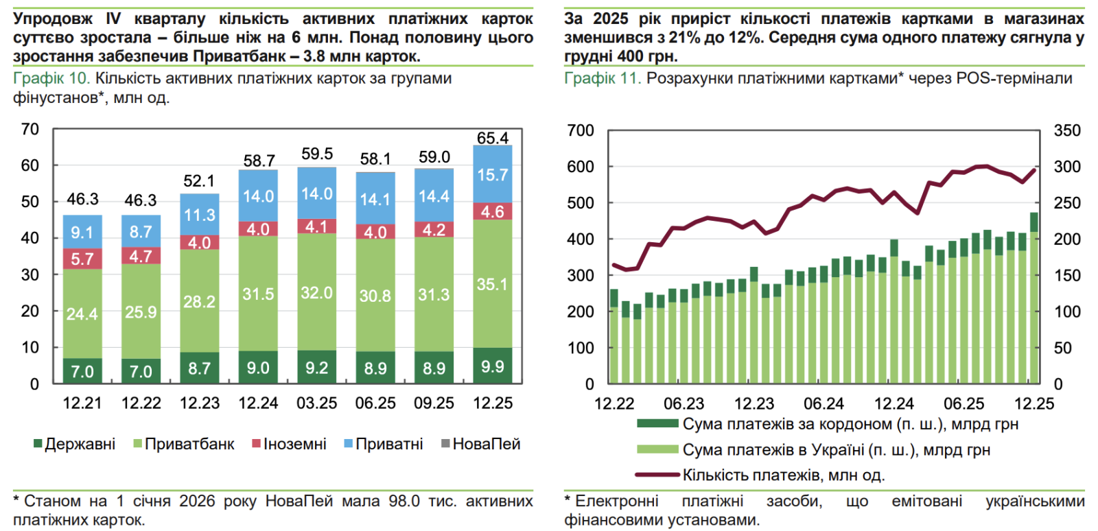 В течение IV квартала 2025 года количество активных платежных карт существенно возросло — прирост составил более 6 млн единиц. По состоянию на конец декабря общее количество карточек в Украине достигло 65,4 млн ед.