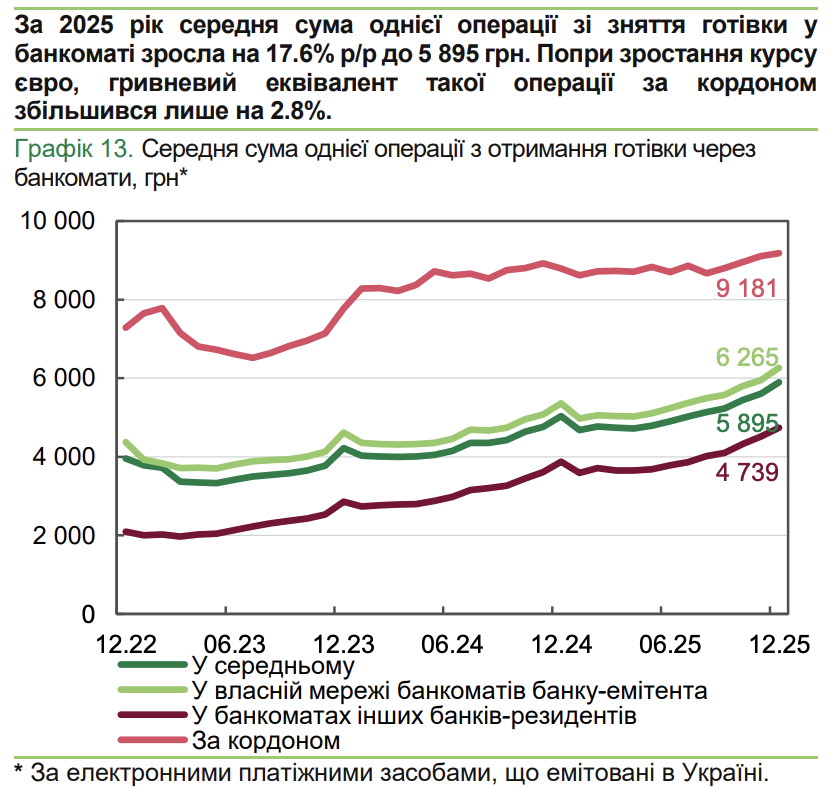 - За рубежом: средний чек при снятии наличных денег за пределами Украины значительно выше — 9 181 грн. При этом гривневый эквивалент такой операции вырос всего на 2,8%, несмотря на изменение курса евро.