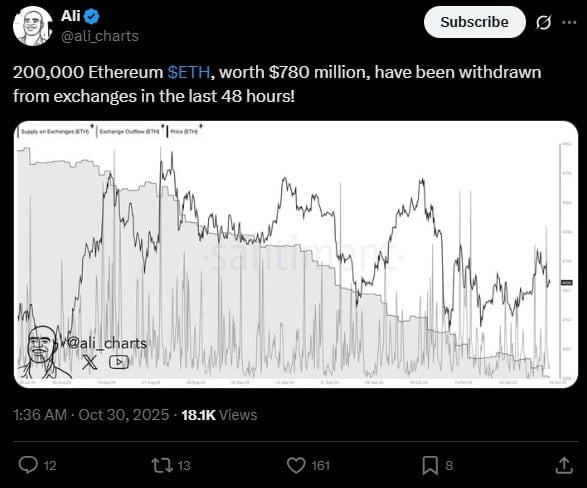 Однако есть трансферы, которые не столь очевидны. Об одном из них сообщил Али Мартинес. В одном из своих недавних постов на X опытный эксперт криптовалютного рынка представил данные, показывающие, что в конце недели киты увели с бирж 200 000 монет. кусочки ETH. Список, распространенный Мартинесом, подготовлен известной аналитической платформой Santiment.