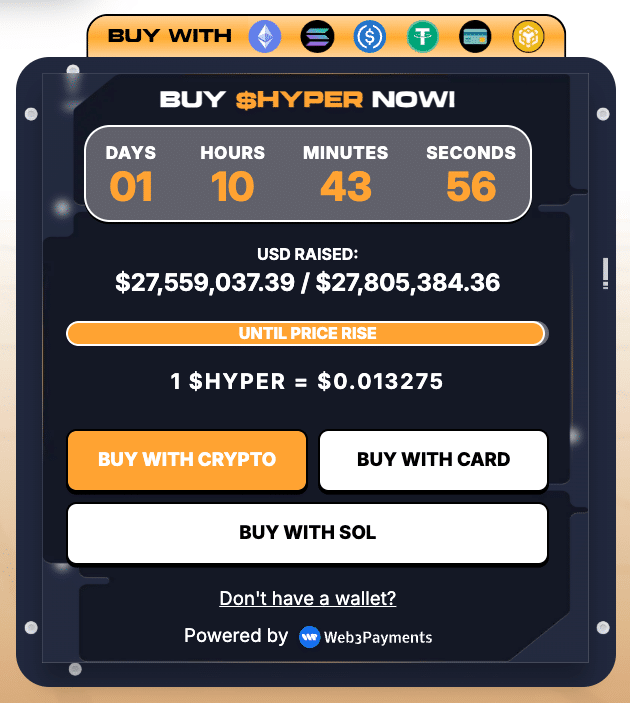 В настоящее время инвесторы могут присоединиться к предварительной продаже Bitcoin Hyper на сайте проекта. Токены доступны в предварительной продаже и их можно приобрести за криптовалюты: SOL, ETH, USDT, USDC, BNB или с помощью платежной карты.