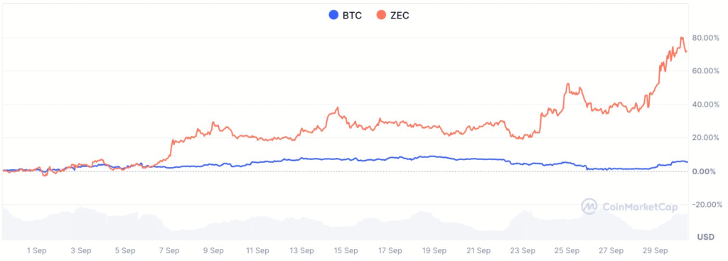 Zcash (zec) сделал одно из самых впечатляющих движений месяца. Он получил более 102% по сравнению с биткойнами (BTC) в сентябре этого года. Пара ZEC/BTC преодолела долгосрочную тенденцию, которая годами выдвигала криптовалюту на основе конфиденциальности к краям. Внезапно он стал одним из лучших процветающих активов на рынке. Для тех, кто находится на рынке достаточно долго, чтобы запомнить первый насильственный цикл ZEC, этот шаг поразителен. Хотя не без серьезных оговорков.