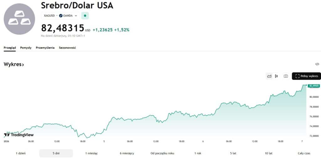Однако последние дни принесли новую динамику цен на серебро. Металл отскочил от недавних минимумов в начале года и на момент написания выше $82 за унцию. За последние 5 дней серебро подорожало примерно на 13%.