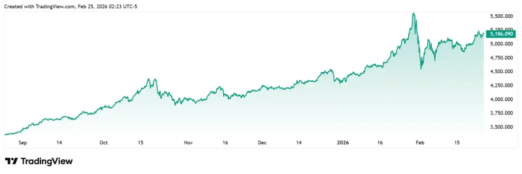 На бумаге все должно работать против золота. Реальные процентные ставки не сходят с ума, доллар не падает, а мировая экономика, хотя и полна напряженности, еще не перешла черту паники. И тем не менее, слиток только что снова преодолел уровень в 5000 долларов, и похоже, что гравитация на него больше не действует. Ручир Шарма, председатель Rockefeller International, говорит это прямо: это больше не ралли, основанное на фундаментальных принципах.